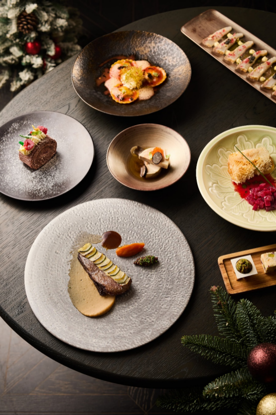 以自然馈赠为灵感,平安夜七道式晚餐拯救海洋与回归的丰饶滋味。开篇「清酒渍安康鱼肝」柔以润肤开启味觉之旅,主菜「低温慢烤M9澳洲和牛友三角」佐黑松露汁,锁住肉汁浓。匠心之作「松笠烧逆鳞红甘鲷」采用传统日式技法,鱼鳞立起如松果绽放,搭配甜菜头泡沫与菲达芝士,宛如雪地中绽放的红宝石。