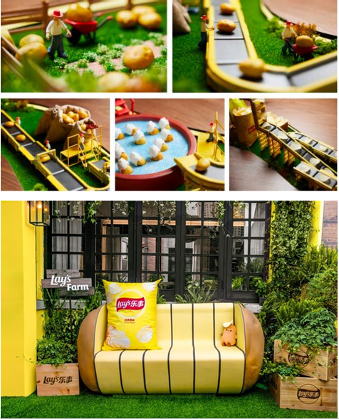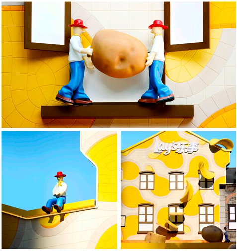 这份先锋美学巧思,更以跨界共创的形态渗透进空间各处。乐事携手时尚设计师品牌8ON8,共同打造极具动态张力的艺术装置:餐厅外立面上,趣味鲜活的小人形象,生动演绎着从土豆到薯片的奇妙转变。他们或搬运土豆或惬意休憩,仿佛为这场土豆盛宴奏响欢快序曲,自然引领食客开启美味探索之旅。