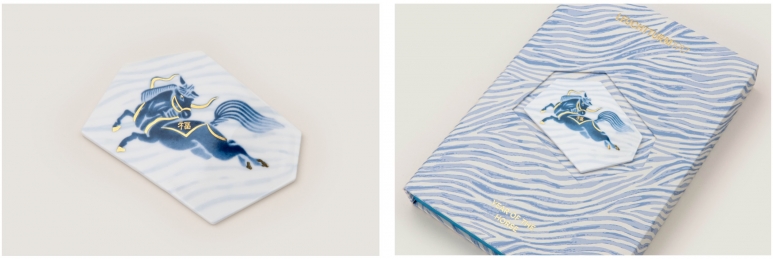 -马年真金鎏彩艺术瓷片:选用高温骨瓷材质,以青花纹饰为基底,采用德国贺利氏(Heraeus)高纯贵金属金水经高温淬炼而成。瓷片釉色温润,纹理细腻,创新磁吸设计,适配多元高端场景。既可嵌入礼盒封面作艺术陈列,亦能吸附于家居提升格调。