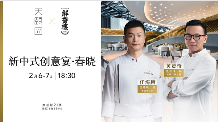 此次合作,是天颐行政总厨黄赞奇及解香楼主厨任海鹏在对季节与自然的敬意之下共同孕育的灵感结晶。天颐以廿四节气为灵感,将不时不食的理念融入至独具匠心的新中式创意料理;解香楼则深耕江南饮食文化,将水乡风物与当代厨艺技法融为一体。当新式粤菜遇见创意江南,濠江的灵感与水乡的诗意交相辉映,共同成就一场和谐共融的美食体验。