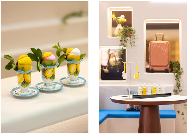 空间中央特别打造“泳池露台”装置,蓝色马赛克瓷砖铺陈其上,地中海印花遮阳伞与躺椅点缀其间,度假意趣自然流露。阿马尔菲柠檬与木槿花错落陈设点缀其中,为 19 Degree Lite 与 Voyageur 系列注入浓郁的海岸风情。